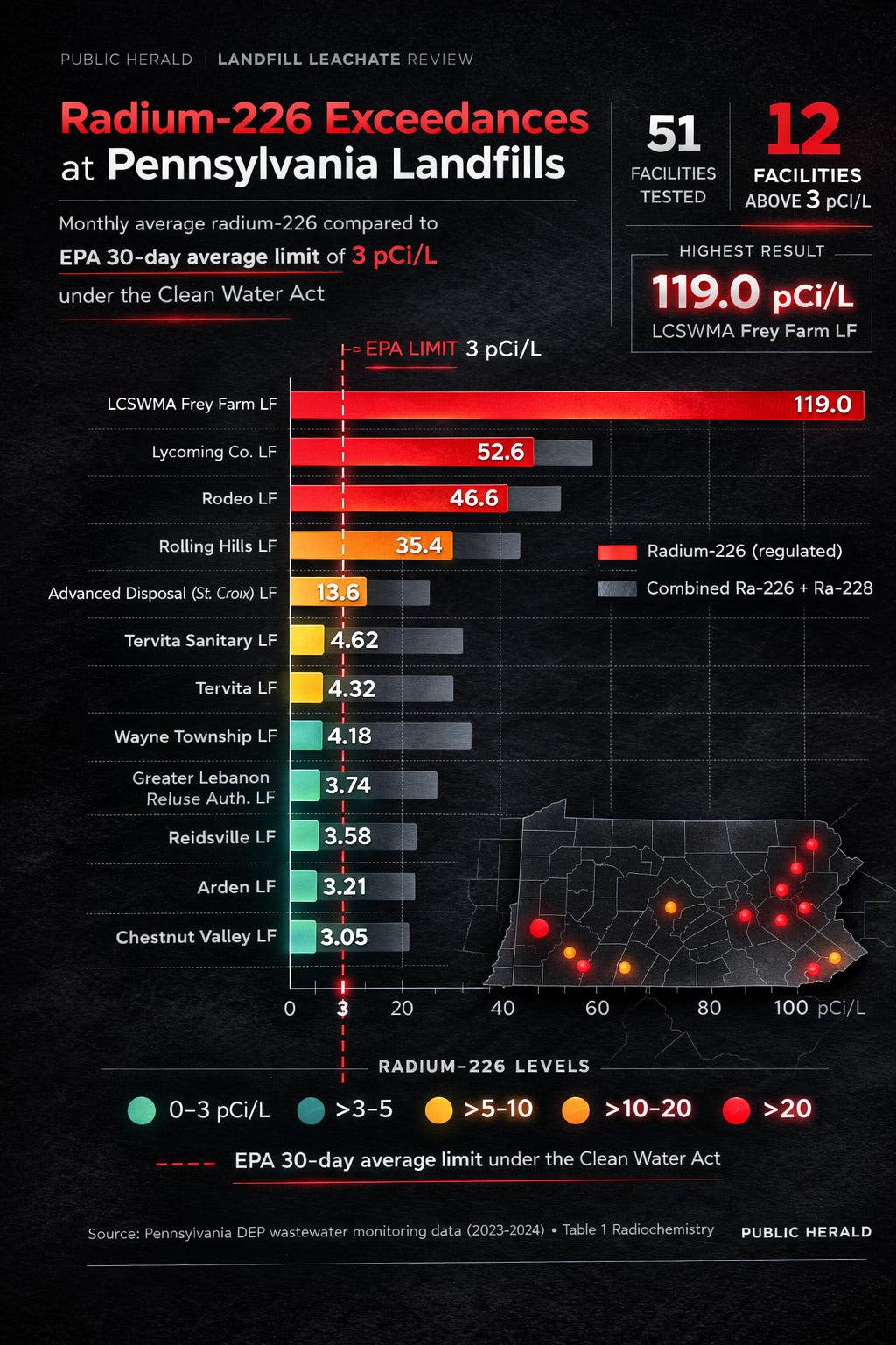 In 2019 in Belle Vernon, Public Herald reported one sewage plant discharge sample detected 8 pCi/L of combined radium-226 and radium-228, while leachate straight from the landfill tested at 50 pCi/L (this story is connected to the Tervita Sanitary Landfill).