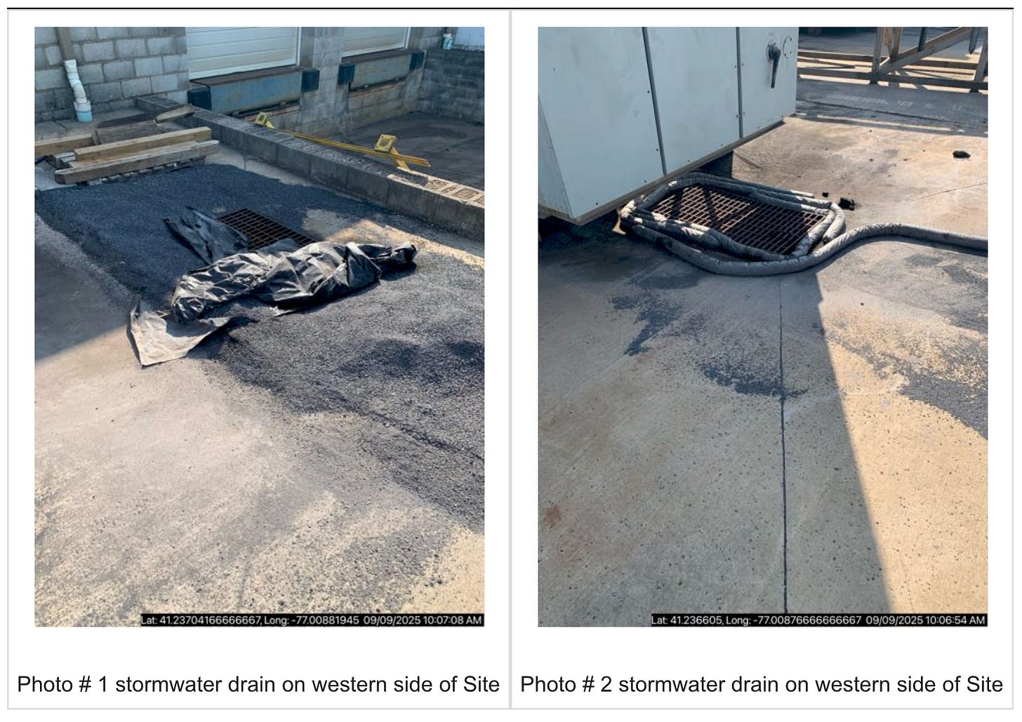 On September 2, inspectors observed new absorbent socks in storm drains, 8,000 gallons recovered from inside the building (after heavy rainfall), and report 30,000–40,000 gallons still onsite per the company’s estimate.