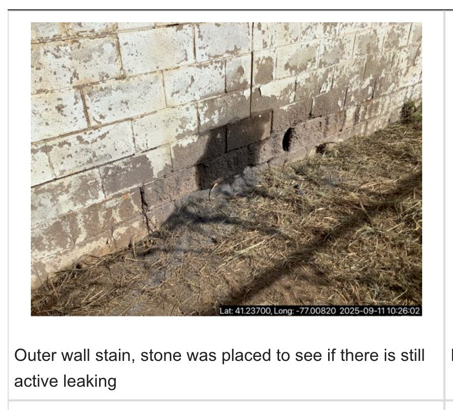 September 9, records reveal continued staining on the south wall, B-side residues, and a frac tank being emptied.